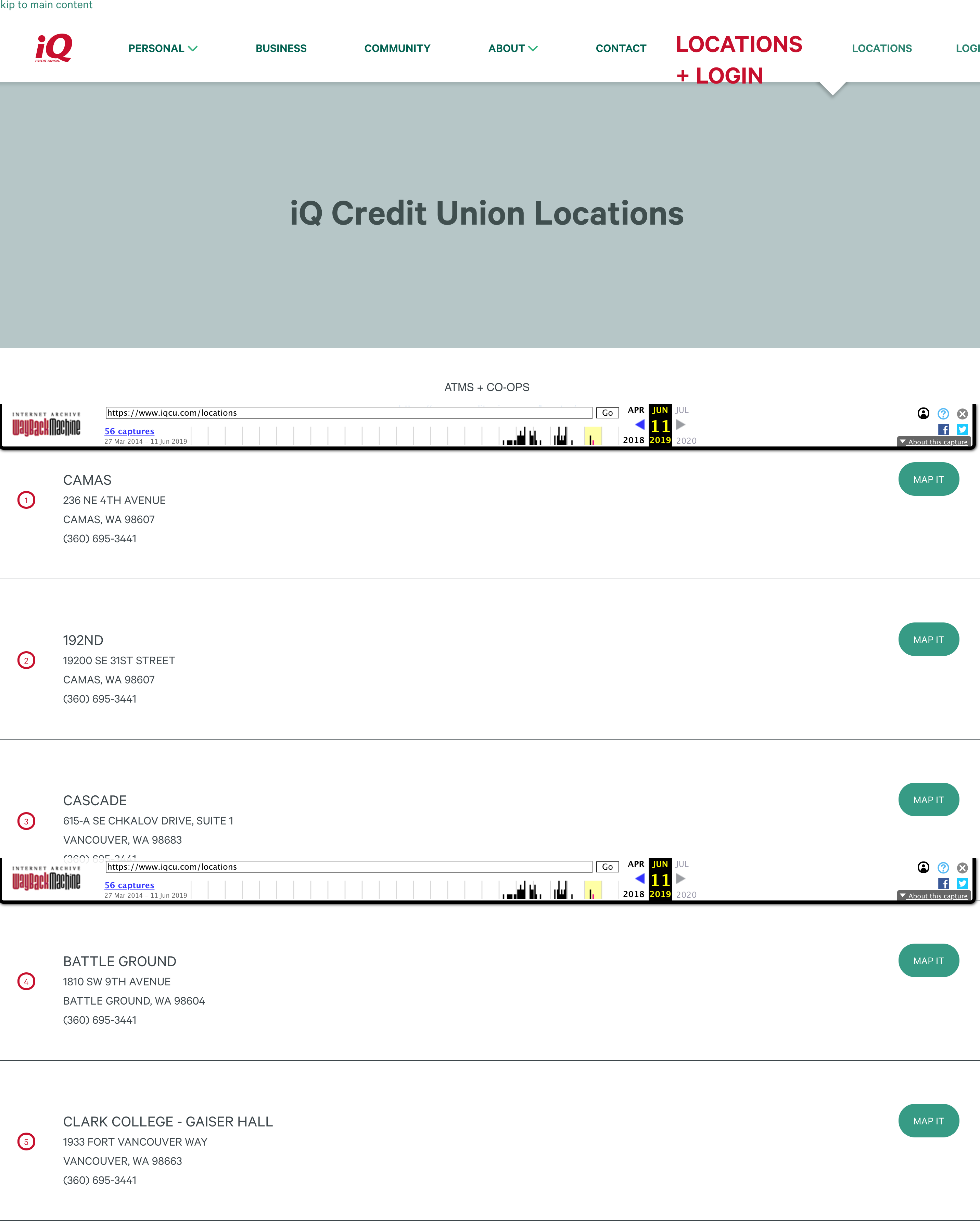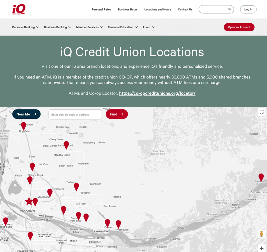 With more than a dozen branches spread out around the greater Vancouver, Washington, area, iQCU needed an interactive way for website and mobile users to find locations, get directions and hours, and see what services are offered at each.