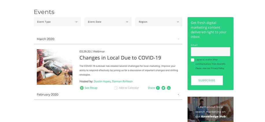 We used HubDB to build out a database of upcoming events for Brandify. Additionally we built in some great filtering and sorting features that allow clients to sort by: event type, event date and region.