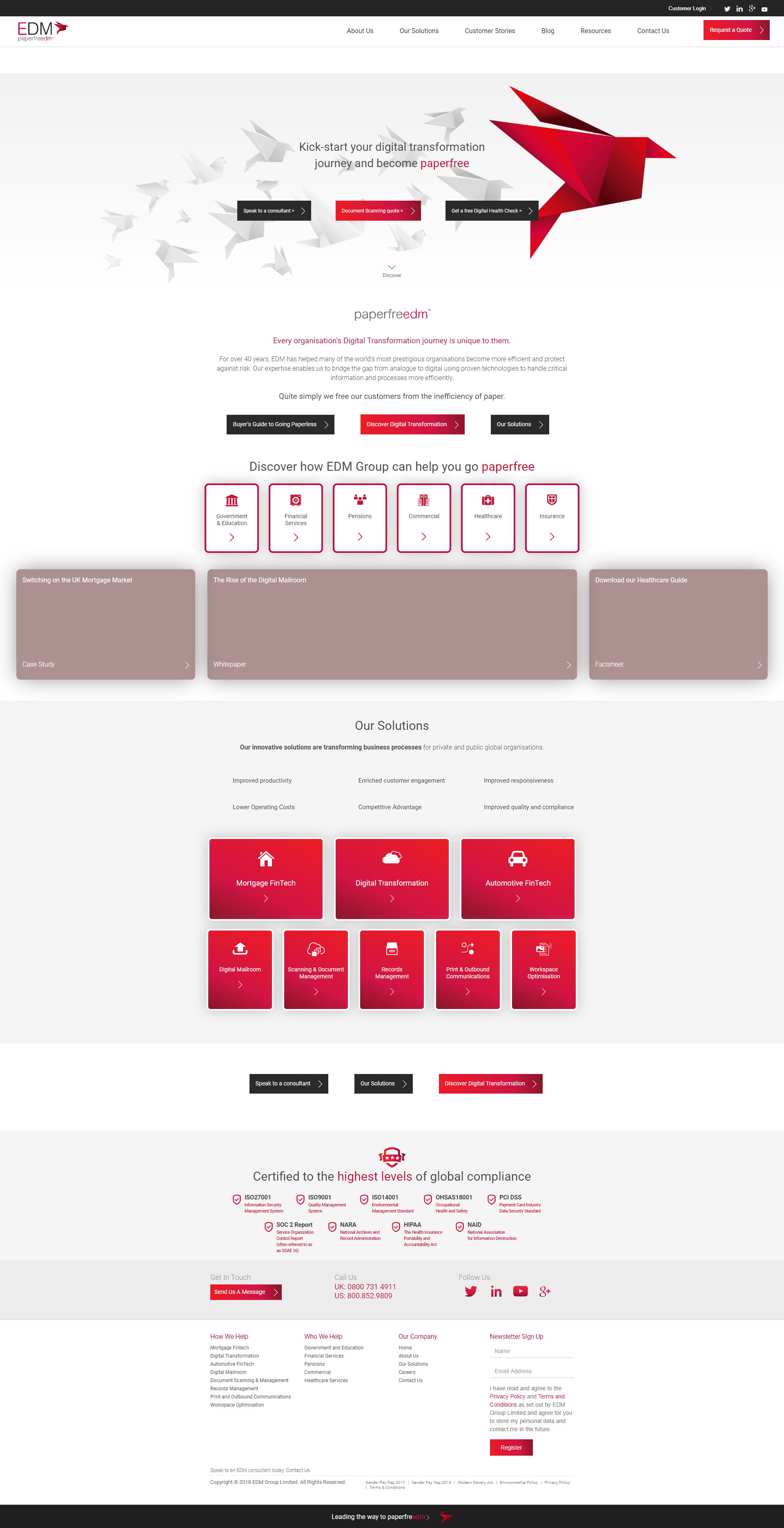 Based on multiple intensive discovery and brainstorming sessions, we completely re-defined the user journey of the website. The output of this was a content map that was specifically tailored to EDM's ideal customer. To draw the users eye to relevant content, we utilised a more contemporary, content-led design, with a focus on white space. The design lends itself to exhibiting social proof, which was essential as EDM work with well-respected and well-knowm organisations.