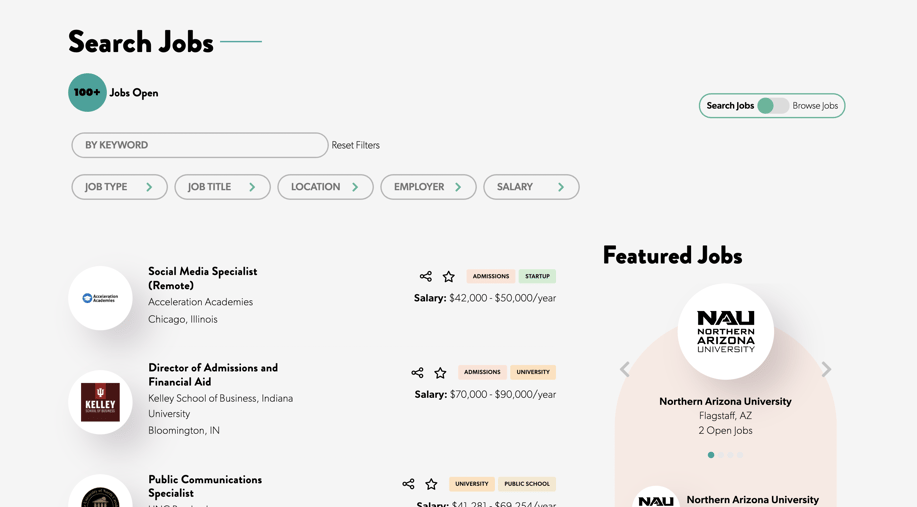 Browse, favorite, and follow job postings at universities, agencies, and edtech companies alike. Job listings are exclusively for admissions and marketing jobs available in and around higher ed. Every job posting has a salary or salary range — say goodbye to guesswork and hello to transparent job listings. We make it easy to be notified when an employer you follow posts a new job or when a new job with a title you follow is posted.