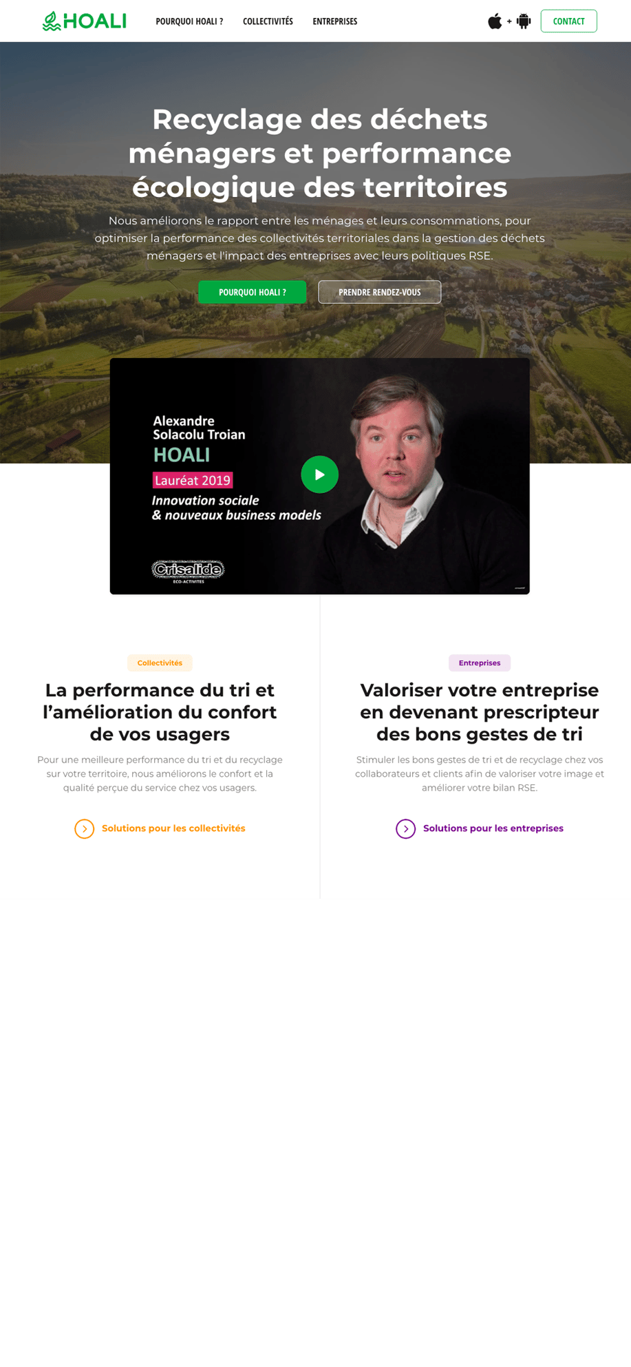 The main project was to build an attractive website addressing a B to B to C problem. Hoali has multiple missions. First, training local authorities and companies in their awareness of sustainable development in their day to day functions. Then, providing consumers an app that will make their life way easier in terms of waste sorting.Hence, the website has to answer the needs of those two personas in the most optimal way.