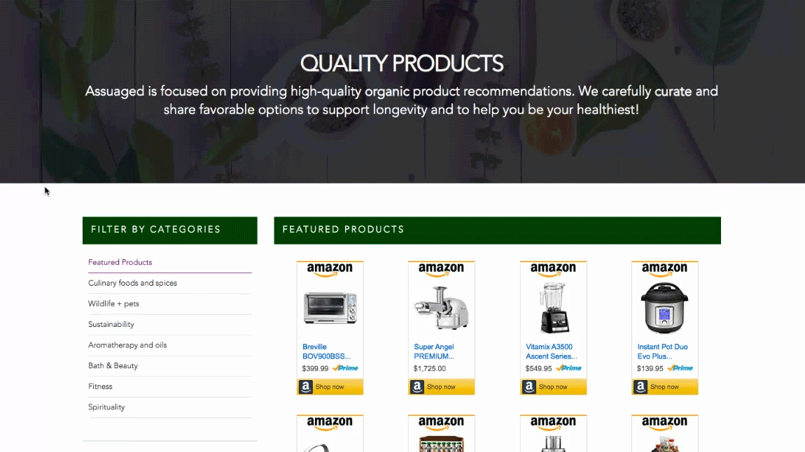 Assuaged had two problems to solve: improve the product page’s visual appeal and better navigation by categorizing products. They also needed a section to highlight featured products to help stimulate sales.