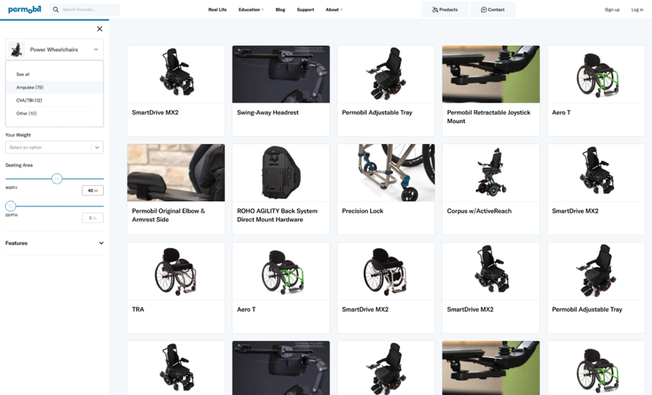We built this Product Explorer Application for the US site, with an Airtable database and Algolia. This tool allows a customer to find the right wheelchair, not by product attributes, but by using their diagnosis and preferences via an image gallery and filters.