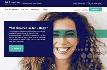 24|7 recruits pharmacy temporary placements in Canada and France. Since they have two different personas, we created a double HubSpot theme to adapt 24|7's brand to each target: a brighter and bolder version for the candidates, and a simple straightforward entrance for the recruiters. To give their 25 collaborators the freedom to focus on their human-centered service, we integrated another client’s external solution and automated small repetitive tasks.