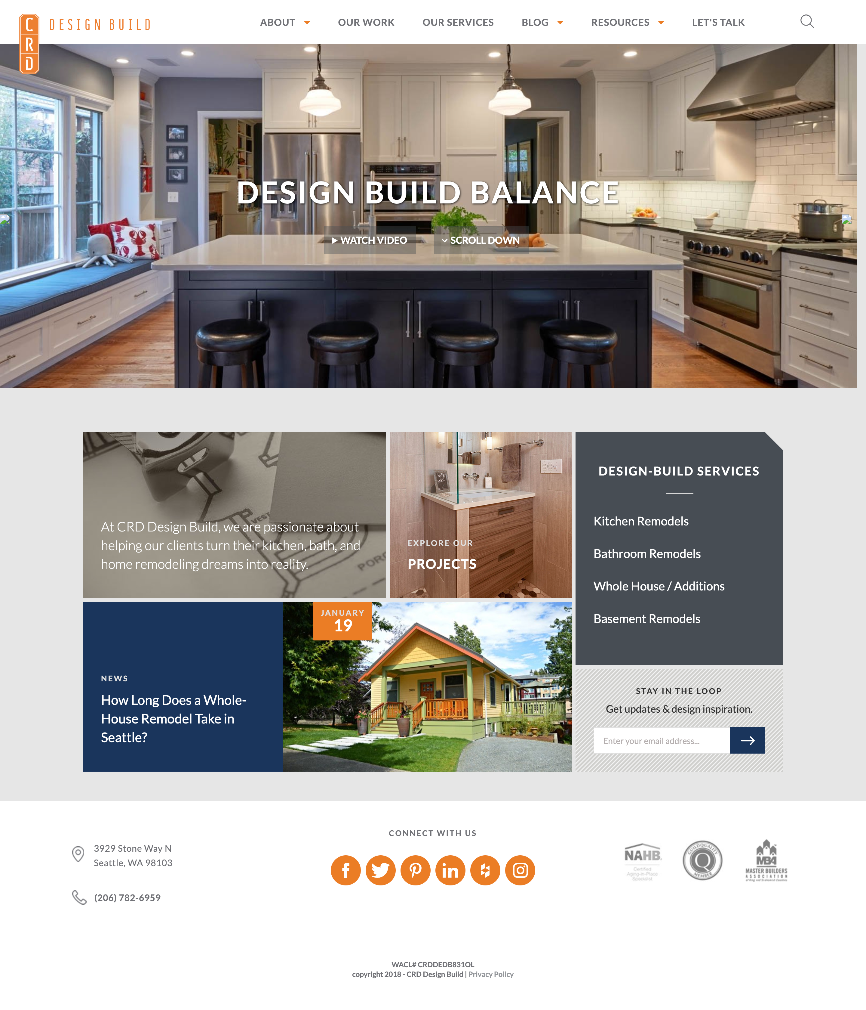 With a large portfolio of successful, award-winning projects, CRD Design Build wanted to initiate a website refresh that leveraged its vast gallery of remodel imagery and simplified design to enhance the user experience.