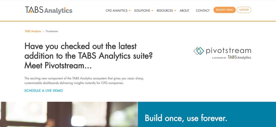 TABS Analytics is a technology-enabled analytics firm that’s been serving the consumer packaged goods industry since 1998. After purchasing PivotStream in 2017, another company in their industry, they had the need to seamlessly represent both companies on their website. PivotStream's representation was to be a product, or division of, TABS Analytics. They needed a visual way to represent this throughout their site so it was obvious and inclusive to both TABS and PivotStream users that the companies had merged together.